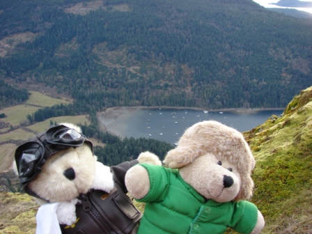 Ooooohhhh... we are on top of a mountain! A beary tall mountain... With a beautiful view of the water. Except for that silly chain-link fence!