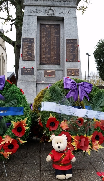 Hullo, Sergeant Sandy Bear here, member of the RCMP Bear Squad. We had Remembrance Day up here on November 11 and I was chosen to participate in the parade and ceremony. It's a big honour and I made sure my uniform was spiffy and snappy!